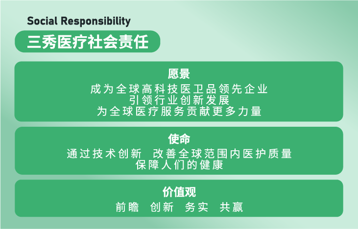 当我们承担起社会责任时,我们始终秉持着成为全球高科技医卫品领先企业的愿景,引领行业创新,为全球医疗服务贡献更多力量。在坚守着前瞻、创新、务实和共赢的价值观的同时,我们务实地将每一项创新转化为实际的产品和服务,确保用户能够真正受益。我们深知,作为医卫品行业的领先企业,我们肩负着重大的社会使命,即通过不断的技术创新,为全球医疗服务的提升贡献自己的力量。